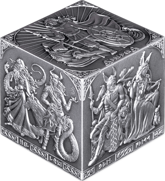 Die Würfelform allein hebt dieses Stück bereits aus der Masse hervor. Während klassische Münzen rund und flach daherkommen, bricht der Nordische Götter Würfel mit allen Konventionen. Seine Maße von 45,6 × 45,6 × 45,6 mm machen ihn zu einem kompakten, aber gewichtigen Objekt, das man buchstäblich von allen Seiten betrachten und bewundern kann. Drehen Sie ihn in der Hand, und mit jeder Wendung offenbart sich eine neue Gottheit, eine neue Szene, ein neues Kapitel der nordischen Saga.