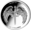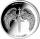 Die Rückseite steht dem in nichts nach. Ein majestätisches Kreuz-Schwert, flankiert von zwei ausgebreiteten Engelsflügeln, dominiert das Bild. Darüber die Angabe „1 OZ 9999 FINE SILVER", darunter der Nennwert von 20 Dollars. Schlicht, kraftvoll, symbolträchtig.