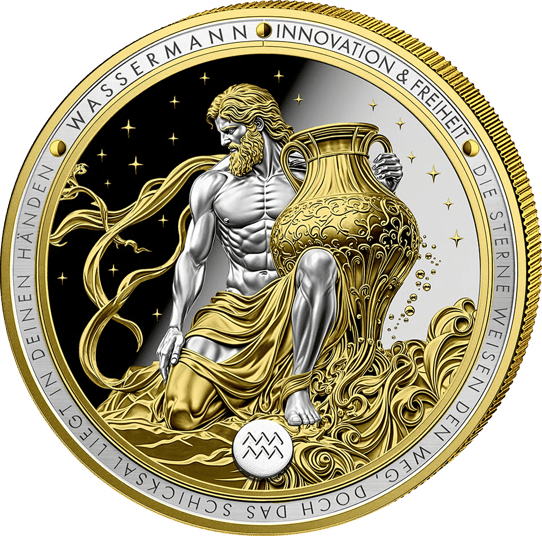 Der Wassermann, jenes Tierkreiszeichen zwischen 21. Januar und 19. Februar, gilt seit jeher als Symbol für Freigeist, Erneuerung und visionäres Denken. Auf der Bildseite dieser Silbermünzen-Prägung zeigt sich der bärtige Wassermannträger in kraftvoller Pose: muskulös modelliert, das Gewand in warmem Gold schimmernd, die Amphore reich ornamentiert. Aus ihr strömt nicht einfach Wasser – es fließt wie flüssiges Gold über den Rand und verliert sich in wogenden Wellen. Am Nachthimmel glitzern feine goldene Sterne, die Umschrift „WASSERMANN – INNOVATION & FREIHEIT“ rahmt das Bild würdevoll ein.