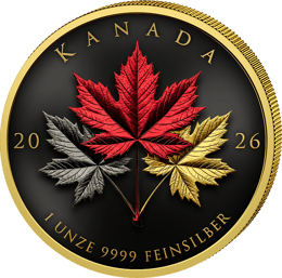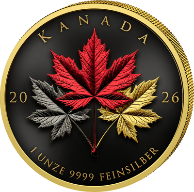 - Motiv: Drei kunstvoll inszenierte Ahornblätter in Rot, Silber und Gold – das ikonische Wahrzeichen Kanadas in dreifacher Ausführung