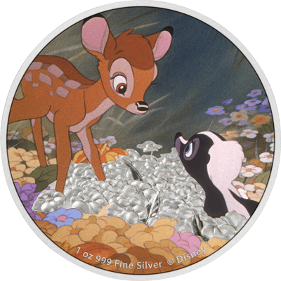 Die Szene, in der sich Bambi und Blume kennengelernt haben, ist auf der colorierten Motivseite der Münze zu sehen. Bambi und Blume schauen sich zu Beginn total überrascht an. Aus der Begegnung entwickelt sich schnell eine innige Freundschaft, die auch dann noch besteht, wenn die beiden erwachsen werden und eine Familie haben. Das Motiv wurde in bunten Farben coloriert, bis auf eine Stelle der Blumenwiese zwischen Blume und Bambi. Die Stelle wurde silbern gelassen. Ganz unten über wunderschönen, orangenen Blumen, sind die Stückelung (1 Unze) und die Feinheit der Münze (999) eingraviert.