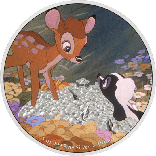 Bambi ist ein Zeichentrickfilm von Disney™, der als ein absoluter Klassiker gilt und auch heute noch von Kindern auf der ganzen Welt geliebt und angeschaut wird. Und das, obwohl der Film bereits im Jahr 1942 herausgekommen ist. Anlässlich des 80-jährigen Jubiläums des Films hat die neuseeländische Prägestätte New Zealand Mint daher eine Münzserie entworfen, deren Münzen mit unterschiedlichen Szenen aus dem Film geprägt sind. Und diese Silbermünze ist ein Teil davon. Da das Erscheinungsjahr von Bambi 1942 lautet, ist die Gesamtauflage der Münze auch auf 1.942 Stück limitiert.