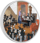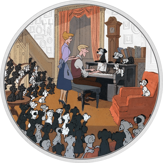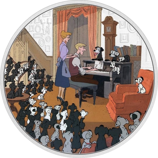 Auf dem farbigen Motiv der Vorderseite der Silbermünze wurde die Schlussszene des beliebten Disney™-Klassikers 101 Dalmatiner™ abgebildet. Die Dalmatiner-Welpen wurden aus den Fängen der bösen Cruella de Vil™ befreit und befinden sich nun sicher im Haus von Roger und Anita. Alle versammeln sich um Klavier herum und hören dem talentierten Musiker Roger dabei zu, wie er ein wunderschönes Lied spielt. Die Welpen sind immer noch zum Teil mit Ruß bedeckt.