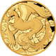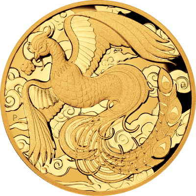 Auf der Vorderseite dieser Goldmünze ist ein Phönix zu sehen. Der Phönix ist ein großer pfauenartiger Feuervogel, der seinen Ursprung in der ägyptischen und griechischen Mythologie hat. Der Phönix wird aufgrund seiner goldenen und roten Federn sowohl mit der Sonne als auch mit dem Element Feuer assoziiert. Der Phönix geht in leuchtende Flammen auf, wenn sein Leben sich dem Ende zuneigt, und steht dann aus seiner eigenen Asche wieder auf. Deshalb symbolisiert er im ägyptischen Glauben Unsterblichkeit.