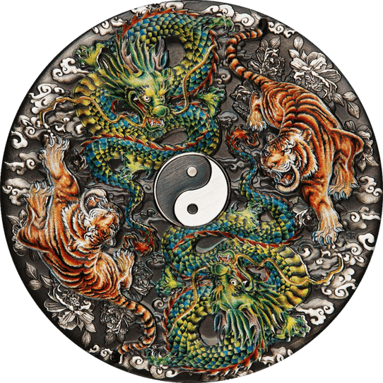 Die Münze zeigt zwei Drachen und zwei Tiger, die sich um das zentrale Yin-Yang Symbol scharen. In der chinesischen Mythologie repräsentieren der Drache und der Tiger Macht, Reichtum, Glück, Mut und Stärke. Die Verdoppelung dieser mystischen Kreaturen auf der Münze symbolisiert eine Verdoppelung ihrer glücksbringenden Einflüsse.