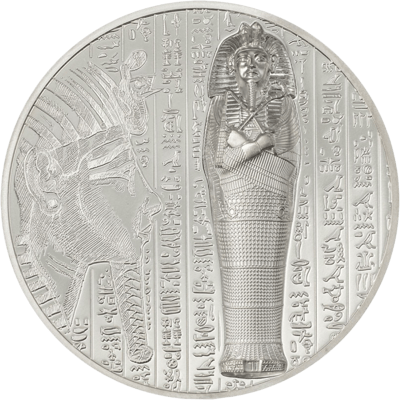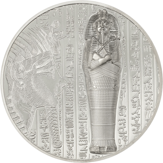 Im Vordergrund steht das dank dem High Relief besonders auffällige Abbild der Pharaonen Mumie. Das High Relief, bei dem der Sarkophag aus der Münze ,,heraussticht”, lässt den Anschein erwecken, dass die Seele des Pharaos gerade in das Jenseits übergeht. Diese Prägung ist dank der modernen smartminting© Technologie möglich. Eine Sensation in der Münzprägung!