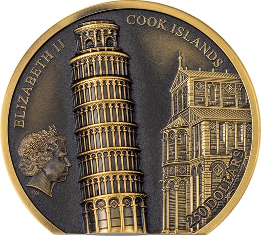 Antike Eleganz: Beeindruckendes Antik Finish und Ultra High Relief Prägung, die den schiefen Turm von Pisa lebendig erscheinen lässt
