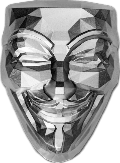 Exklusives Design: Die 2 Unzen Silber Guy Fawkes Maske besticht durch ihr einzigartiges, dreidimensionales Maskendesign
