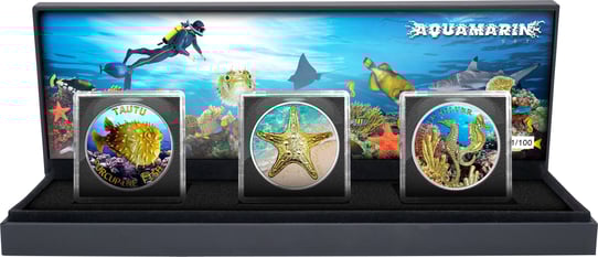 Zu diesem Set gehören drei hochwertige und wunderschöne Silbermünzen der Stückelung 1 Unze. Auf den Motivseiten der Münzen ist jeweils ein Meerestier zu sehen: der Seestern, das Seepferdchen und der Kugelfisch. Spektakulär ist, dass die Tiere vergoldet wurden, während der Hintergrund farblich gestaltet wurde.