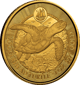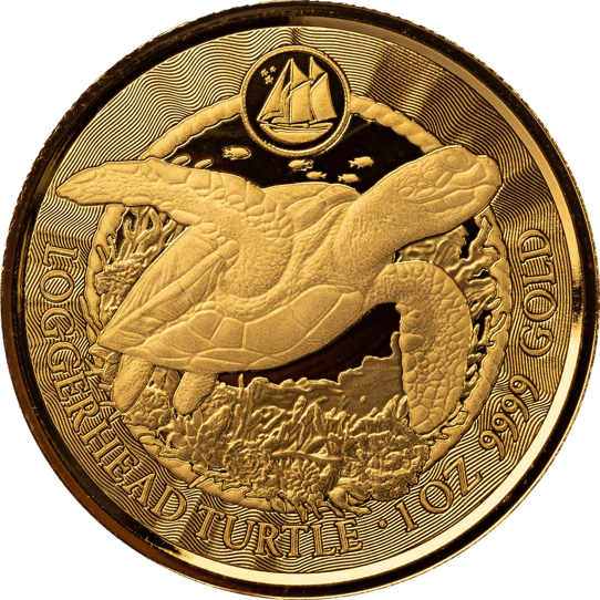 Das Motiv der Münze zeigt eine detaillierte Prägung einer Meeresschildkröte, die majestätisch über ein Korallenriff schwimmt. Der Panzer der Schildkröte zeichnet sich durch eine feine Strukturierung aus, die die Handwerkskunst der Mintmeister unter Beweis stellt. Unterhalb der Schildkröte prangt der Schriftzug "LOGGERHEAD TURTLE", während am unteren Rand die Angaben "1OZ 9999 GOLD" die Edelmetalllegierung bestätigen. Ein kleines Segelschiff, eingebettet in ein wellenförmiges Muster, ziert den oberen Bereich und verleiht der Münze ein Gefühl von Abenteuer und Entdeckung.