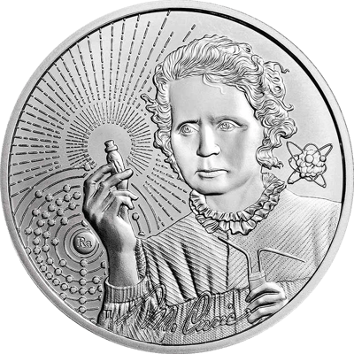 Die sechste Münzausgabe der Serie „Inspirierende Ikonen“ ist der herausragenden Wissenschaftlerin Marie Curie gewidmet und von dem bekannten Münzdesigner Joel Iskowitz entworfen worden. Das eindrucksvolle Motiv zeigt Marie Curie, wie sie ein Fläschchen in der Hand hält und dieses sorgfältig prüft. Das chemische Symbol „Ra“ neben dem Fläschchen gibt Aufschluss über den Inhalt, der das radioaktive Element Radium darstellt. Im Hintergrund sind stilisierte Strahlen zu sehen, die die bahnbrechenden Entdeckungen von Marie Curie auf dem Gebiet der Radioaktivität symbolisieren.