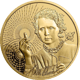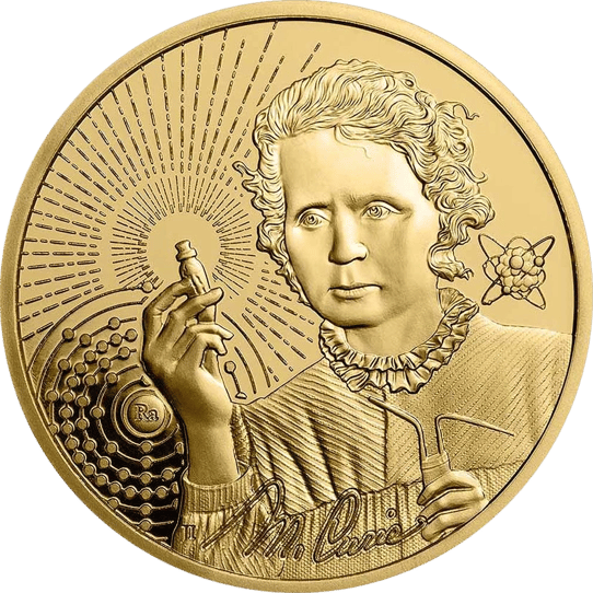 Die Vorderseite dieser Goldmünze zeigt Marie Curie. Sie hält ein kleines Fläschchen in der Hand und ist offensichtlich gerade am Experimentieren. Sie trägt ein lockeres Kleid. Ihre Haare sind kurz und gelockt. Sie ist bekannt dafür, dass sie gemeinsam mit ihrem Ehemann Pierre Currie die chemischen Elemente Polonium und Radium entdeckt hat. Aus diesem Grund ist im Hintergrund des Motivs auch die chemische Abkürzung Ra zu sehen. Radium ist ein Element, das von Natur aus radioaktiv ist. Für ihre Errungenschaften wurde sie belohnt und mit einem Nobelpreis in Physik und einem in Chemie ausgezeichnet. Im Ersten Weltkrieg hat es sich Marie Curie zur Aufgabe gemacht, verletzten Soldaten zu helfen. Sie hat dafür einen Röntgenwagen erfunden. Ihre Arbeit mit radioaktiven Strahlungen hatte allerdings tödliche Folgen für die hochintelligente Wissenschaftlerin. Sie starb am 4. Juli. 1934 im Alter von 66 Jahren an Leukämie.