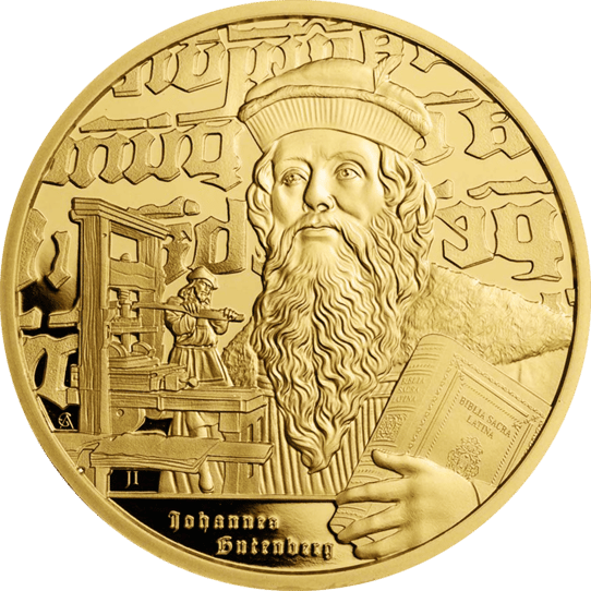 Das kunstvolle Relief der Münze zeigt eindrucksvoll Johannes Gutenberg, wie er stolz ein Exemplar der "Biblia Sacra Latina" hält. Der wallende Bart und die charakteristische Mütze des Erfinders sind in feinstem Gold eingefangen, umgeben von gotischen Schriftzeichen, die den kulturellen Reichtum der Epoche widerspiegeln. Links ist eine Szene aus einer Druckerei mit einer historischen Druckpresse zu erkennen, die die revolutionäre Erfindung Gutenbergs darstellt. Unterhalb der zentralen Figur prangt der Name "Johannes Gutenberg", eingegraviert in das glänzende Metall. Die Rückseite ziert ein triumphales Bild einer Muse, die in einer Geste der Inspiration ihren Arm der Sonne entgegenstreckt – ein Symbol für das Licht des Wissens, das Gutenberg der Welt gebracht hat.