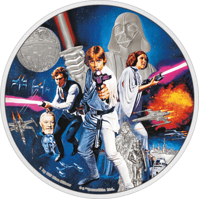 Diese Silbermünze ist dem vierten Teil der Star Wars™ Reihe gewidmet. Dieser trägt im Original den Titel „Star Wars™: Episode IV A New Hope“. Auf der Münze ist das gleiche Motiv zu sehen, das bereits die Filmposter zierte. Auch die farbliche Gestaltung des Münzmotives stimmt mit dem Filmposter überein.