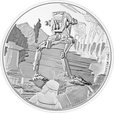 Als Motiv für die Vorderseite dieser Silbermünze wurde der Star Wars™ Kampftransporter AT-ST Walker™ ausgewählt. Dieser fällt durch seine langen und dürren Beine auf. Aus diesem Grund wird er auch chicken walker genannt. Die Abkürzung AT-ST™ bedeutet All Terrain Scout Transport™.