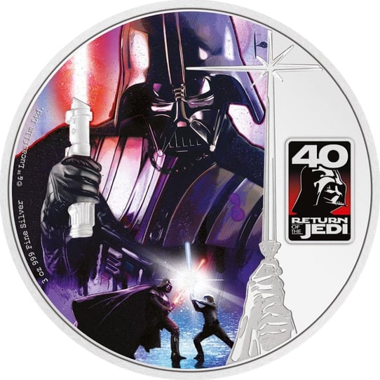 Rechts neben dem Motiv ist in Silber eine Hand zu sehen, in der sich ein silbernes Lichtschwert befindet. Daneben ist ein koloriertes Plakat eingeprägt, auf dem Darth Vaders™ Helm zu sehen ist sowie die Zahl 40 und der Titel des Films „Return of the Jedi“. Auf der Motivseite sind zudem die Stückelung der Münze (3 Unze) und deren Feinheit von 999 eingeprägt.