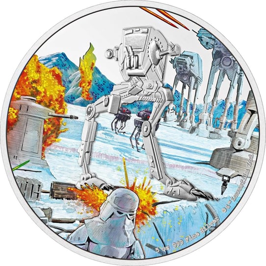 Die Münze zeigt eine detaillierte Darstellung des AT-ST Walker aus der Star Wars Serie. Dieses Fahrzeug ist ein Symbol für die militärische Stärke und Macht des Galaktischen Imperiums und wird von Star Wars Fans weltweit erkannt und geschätzt. Das Motiv ist coloriert und zeigt den Walker in Aktion während der Schlacht von Hoth. Im Hintergrund sind zwei AT-AT Walker des Galaktischen Imperiums im Kampf gegen die Rebellen zu sehen.