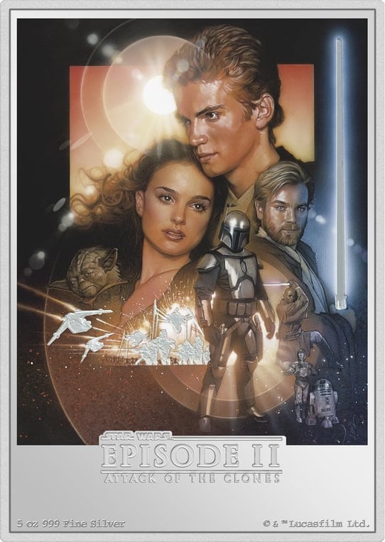 Entdecken Sie die 5 Unze Silber "Angriff der Klonkrieger" Star Wars Posters 2024 PP