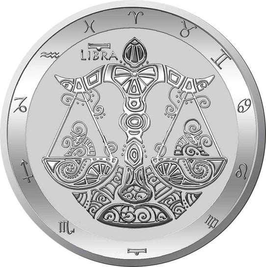 Die Vorderseite dieser Silbermünze zeigt eine Waage, die mit kunstvollen Symbolen verziert ist. Die Waage symbolisiert das gleichnamige Sternzeichen. Um das Motiv kreisen die zwölf astrologischen Symbolen der Sternzeichen.