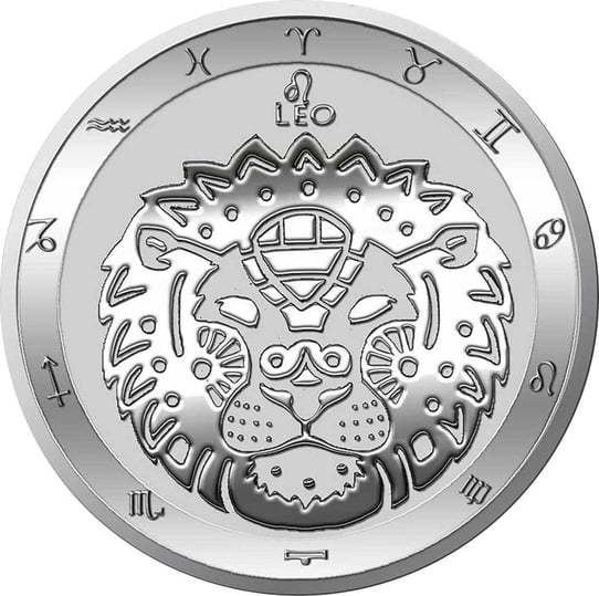 Auf der Vorderseite der Silbermünze ist der Kopf eines Löwen zu sehen, denn die Münze ist dem Sternzeichen „Löwe“ gewidmet. Neben dem astrologischen Symbol für „Löwe“ sind auch die Symbole für die restlichen Sternzeichen auf der Vorderseite zu sehen.