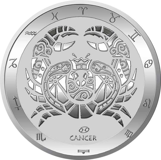 Auf der Vorderseite der Silbermünze ist ein ganz besonders aussehender Krebs eingeprägt. Um ihn herum befinden sich die astrologischen Symbole der zwölf Sternzeichen.