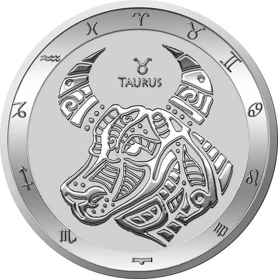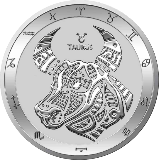 Die Vorderseite dieser Silbermünze ist mit dem Kopf eines Stieres geprägt, denn die Münze wurde zu Ehren des gleichnamigen Sternzeichens kreiert. Die astrologischen Symbole der zwölf Sternzeichen sind ebenfalls Teil des Motivs.