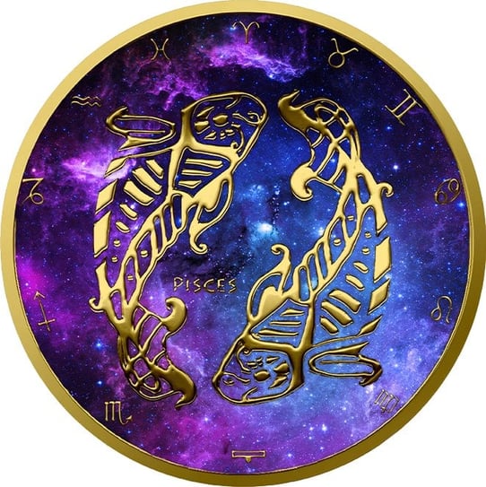 Die Münze besteht aus Silber mit einer Feinheit von 999/1.000 und ist auf beiden Seiten mit Gold veredelt. Das Motiv zeigt zwei vergoldete Fische, umgeben von den zwölf astrologischen Symbolen der anderen Sternzeichen. Der Hintergrund ist dunkel wie die Nacht mit vielen kleinen leuchtenden Punkten, die die Sterne am Nachthimmel symbolisieren.