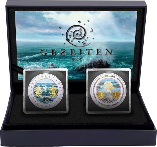 Im Zentrum der Motive sind zwei Meerjungfrauen abgebildet, die sich jeweils an einem Anker festhalten. Eine Münze zeigt mittig die Ebbe und die zweite Münze zeigt mittig die Flut auf der Münz-Vorderseite, jeweils wunderschön coloriert. Auf der Rückseite wird auf beiden Münzen der Nennwert und auch das Portrait der Queen Elisabeth II abgebildet. Zusätzlich sind zwei Kreise abgebildet, die einen Einblick in das “innenliegende” Uhrwerk, wie es auch häufig bei Automatikuhren genutzt wird, symbolisieren sollen.