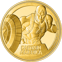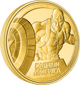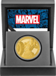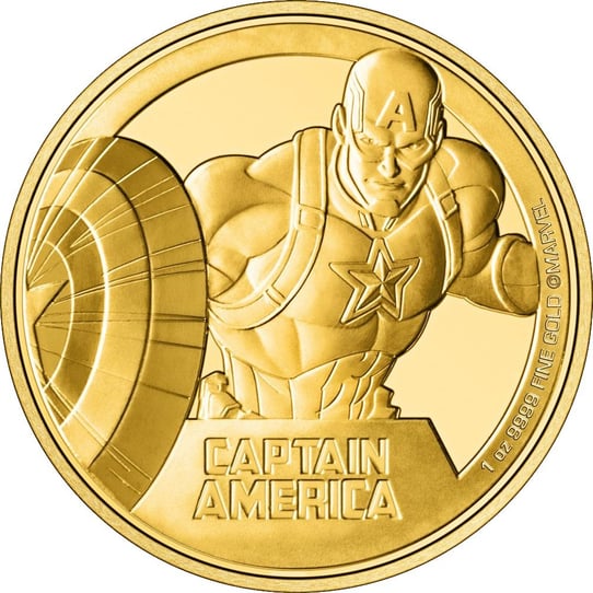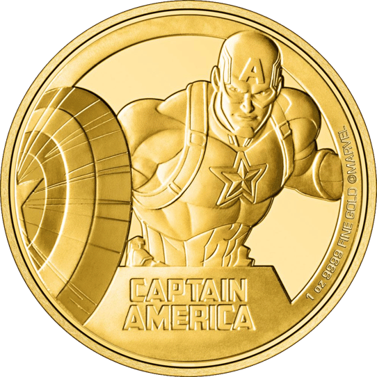 Auf der Vorderseite der Goldmünze ist Captain America™ eingeprägt. Er ist geduckt und hält schützend sein Schutzschild vor sich. Seine Miene sieht siegessicher und entschlossen aus. Er befindet sich mitten im Kampf gegen das Böse und ist in seinem Element. Angst scheint er keine zu haben. Auf dem Schutzschild ist ein Stern zu sehen. Genauso wie auf der Brust seines Anzugs. Auf seinem Helm ist ein großes A abgebildet, das für Amerika steht. Sein eigentlicher Name ist Steve Rogers. Als der Zweite Weltkrieg ausbrach, war es Steve Rogers Ambition, für sein Land zu kämpfen und der Armee beizutreten. Er wurde jedoch abgelehnt, da er zu dünn und nicht muskulös und stark genug war. Allerdings interessierte sich der Wissenschaftler Doktor Abraham Erskine für ihn. Er war auf der Suche nach einer Testperson für ein Experiment und hielt Steve Rogers für geeignet. So kam er zu seinen Superkräften: Kraft, Geschwindigkeit und Flexibilität. Doch nicht nur seine Superkräfte machen ihn aus, sondern auch seine Tapferkeit und seine Einstellung, das Töten zu vermeiden, wenn es geht. So wurde aus Steve Rogers der legendäre Captain America™.