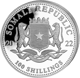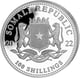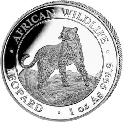 Die silberne Motivseite zeigt den Kopf eines ausgewachsenen afrikanischen Leoparden, während er mit seiner ganzen Pracht mit offenem Maul in die Gegend brüllt. Im Hintergrund ist die afrikanische Steppenlandschaft zu sehen. Entlang des Münzrandes befinden sich die Aufschriften „AFRICAN WILDLIFE LEOPARD“ sowie das Gewicht „1 oz“ und die Feinheit „Ag 999.9“. Die Rückseite zeigt Ihnen das Wappen der Republik Somalia, das von zwei detailliert gezeichneten Leoparden gehalten wird. Darunter sind zwei Speere und zwei Palmwedel zu sehen, die von einem Band gehalten werden.