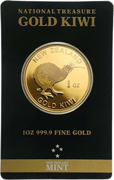 Die 1 oz Gold Kiwi von der New Zealand Mint zeigt auf der Motivseite einen Kiwi-Vogel abgebildet, welcher auf der anderen Seite die Form des Inselstaats Neuseeland mit 4 Sternchen, welche das Sternbild Kreuz des Südens bilden und Neuseelands geographische Lage auf der südlichen Hemisphäre darstellt. Auf der Oberkante der Münze steht das Wort “AOTEAROA” (maorisch für Neuseeland), darunter “1 OUNCE FINE GOLD .9999”. Die Münzen hat keinen Nennwert (wie der Krügerrand) und wird daher am Goldwert bemessen.