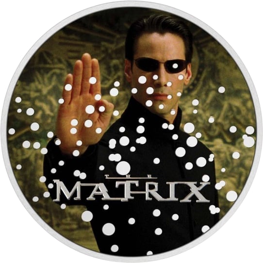 Die Vorderseite der Münze aus 99,9% Silber bildet Neo ab, der einen Kugelhagel aufhält. Zu diesem Zeitpunkt hat er bereits gelernt, die Realität um sich maßgeblich nach seinem Willen zu beeinflussen. Zu sehen ist der Held der Reihe in seinem schwarzen Anzug und seiner markanten Sonnenbrille, die nahezu sinnbildlich für den Film sind. Die Farbveredelung lässt Lücken bei den Geschossen, und bildet auf diese Weise ganz natürlich die Kugeln ab. Die Rückseite zeigt das bekannte Porträt der Königin Elizabeth II. mit den üblichen Angaben zu Feingewicht, Jahrgang und Nennwert.