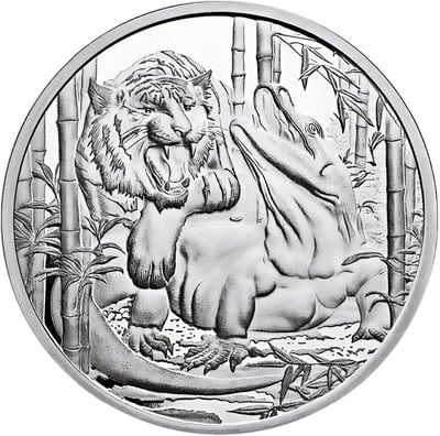 Auf diesem Münzmotiv ist ein majestätischer Tiger abgebildet, der inmitten eines Bambuswaldes Jagd auf einen Komodowaran macht. Der Tiger ist die größte Raubkatze der Welt und kann ohne Zweifel als Spitzenprädator bezeichnet werden. Tiger sind hauptsächlich Fleischfresser und ernähren sich, unter anderem, von Affen, Elchen, Wildschweinen, Tapiren und Fischen.