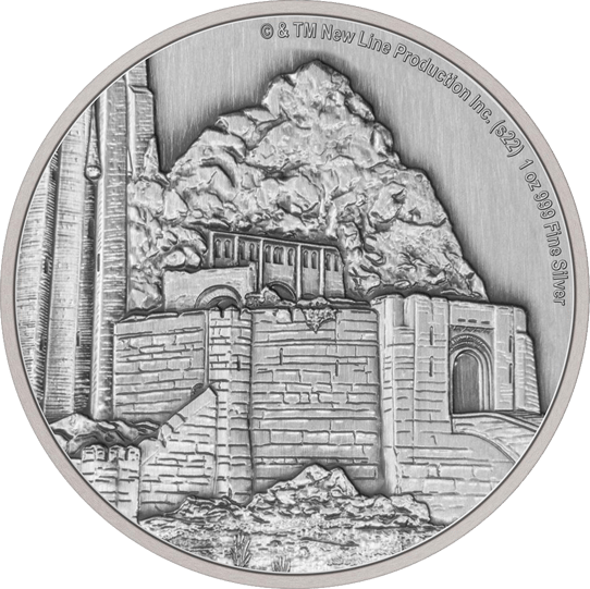 Auf der Vorderseite dieser Silbermünze, die mit einem Antik Finish gestaltet wurde, ist Helms Klamm eingeprägt. Die feste Schlucht ist ein fiktiver Ort, der in der Herr der Ringe™-Reihe vorkommt. Die steilen Klippen kommen bei dieser Darstellung besonders gut zur Geltung.