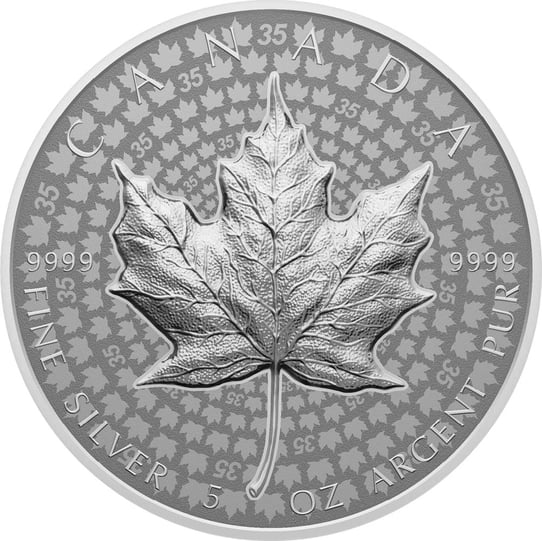 Einzigartiges 35-Jahres-Design – Die Rückseite der Münze ist zum 35-jährigen Jubiläum des Maple Leaf gestaltet. Sie zeigt ein fein gearbeitetes Muster aus kleinen Ahornblättern und der Zahl 35, umrahmt von einem zentral platzierten, großen Ahornblatt in Ultra High Relief.