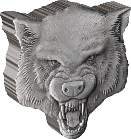High Relief Prägung: Beeindruckende dreidimensionale Darstellung des Wolfes, ein Kunstwerk aus Silber