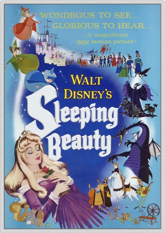 Links oben thront ein Schloss, umgeben von kleineren Figuren, die vermutlich das königliche Gefolge darstellen. Die drei Feen in Rot, Grün und Blau schweben neben dem Schloss, während eine Gruppe von Soldaten in Richtung des Schlosses marschiert. In der Mitte des Posters wird die Prinzessin Aurora in einem langen, purpurfarbenen Kleid und mit einer Rose in ihren Händen abgebildet. Ihre blonden Haare und das Diadem vervollständigen ihr edles Erscheinungsbild. Neben ihr steht die böse Fee Maleficent in schwarzer Robe und mit Krone, neben einer bedrohlichen Drachenfigur.