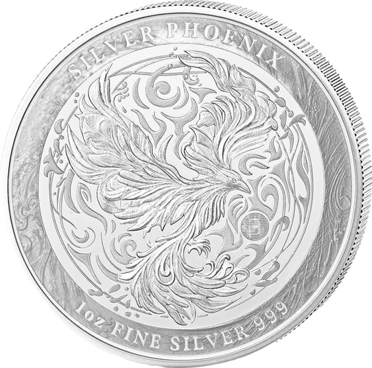 Auf der Vorderseite der Münze erstrahlt ein majestätischer Phönix, der seine Flügel in einer dynamischen und fließenden Bewegung ausbreitet. Die detaillierte Prägung zeigt fein ausgearbeitete Federn mit geschwungenen Linien und Mustern, die an filigrane Verzierungen erinnern. Der Schriftzug "SILVER PHOENIX" am oberen Rand und "1 OZ FINE SILVER 999" am unteren Rand unterstreichen das edle Erscheinungsbild dieser Münze.