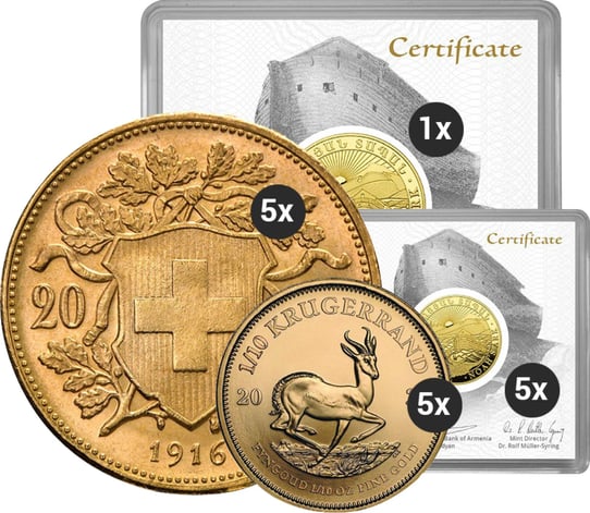 Exklusive Auswahl: Enthält seltene 20-Franken-Münze, 1/10 Krugerrand und armenische Goldmünzen mit Echtheitszertifikaten