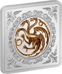 Diese feurige Silbermünze stammt aus einer Kollektion, die zu Ehren der überaus beliebten Serie Games of Thrones™ kreiert wurde. Die Münze selbst ist dem aus der Serie bekannten Haus Targaryen von Drachenstein™ gewidmet. Das Haus gehört zu den großen Häusern von Westeros™ und regierte mehrere Jahrhunderte lang über die Sieben Königslande™. Nach deren Sturz durch eine Rebellion kam das Haus Baratheon an die Macht.