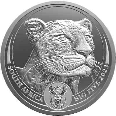 Die Vorderseite der Münze ziert ein prächtiger Leopardenkopf, umrahmt von den Aufschriften "SOUTH AFRICA" und "BIG FIVE 2023", sowie dem Wappen Südafrikas. Ein Symbol für Kraft und Anmut, verkörpert der Leopard die Essenz der afrikanischen Wildnis. Auf der Rückseite sind zwei Leoparden in voller Pracht zu sehen, begleitet von den Aufschriften "FIVE RAND", "1 kg" und "999 Ag". Diese detaillierte Darstellung fängt die Eleganz und das geheimnisvolle Wesen dieser majestätischen Raubkatze ein. Der Silber Big Five Leopard 2023 ist nicht nur eine Sammlermünze, sondern ein Kunstwerk, das die Herzen von Münzenliebhabern höher schlagen lässt.