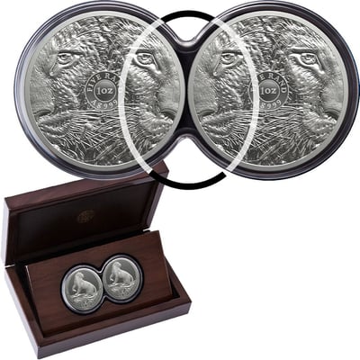 - Material & Feinheit: 2 x 1 Unze reinstes Feinsilber (999/1.000) mit einem Gesamtgewicht von 62,21 g