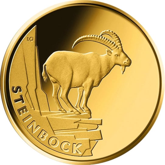 Der blockhafte Schriftzug „Steinbock“ erzeugt einen spannungsvollen Kontrast zur dynamischen Bewegung des Tieres. Auf der Wertseite befinden sich ein Adler, der Schriftzug „BUNDESREPUBLIK DEUTSCHLAND“, die Wertziffer und Wertbezeichnung, die Jahreszahl 2023 sowie zwölf Europasterne. Je nach Prägestätte (A, D, F, G, J) wird zudem das entsprechende Münzzeichen angebracht. Der geriffelte Münzrand rundet das detailreiche Design ab und verleiht der Münze eine besondere Haptik. Tauchen Sie ein in die Welt der Rückkehr der Wildtiere und sichern Sie sich diese einzigartige Goldmünze.