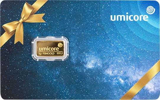 Exquisite Geschenkidee: Edler 1g Umicore Goldbarren, perfekt präsentiert mit Zertifikat und festlicher Schleife