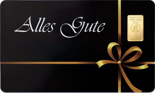 Die FineCard, im Format einer Kreditkarte, ziert eine goldene Schleife und der Schriftzug "Alles Gute", was sie zum idealen Präsent für nahezu jeden Anlass macht. Ob Geburtstag, Jubiläum oder als Zeichen der Anerkennung – diese Karte trägt Ihre besten Wünsche weiter, während der implantierte Goldbarren aus reinem Gold mit einer Feinheit von 999/1.000 den materiellen Wert Ihres Geschenkes unterstreicht.