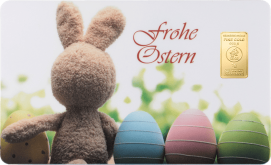Ein strahlendes Geschenk zu Ostern: Der 1g Goldbarren Heimerle und Meule Frohe Ostern FineCard