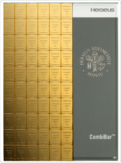 Sie würden gerne in Goldbarren als Krisenschutz investieren – haben dafür aber nur ein geringes Budget zur Verfügung? Dann werfen Sie einen Blick auf unsere 100g Gold Tafelbarren (Combibar). Mit den seit 2011 erhältlichen Stückelungen entscheiden Sie sich für eine praktische, optisch ästhetische Form der Geldanlage in das beliebte Edelmetall. Ausschließlich von weltweit anerkannten Herstellern produziert, übersenden wir Ihnen die hochwertigen 100 g Gold Tafelbarren (Combibar) in einer Kunststoffhülle gesichert und zu einem unschlagbaren Preis.