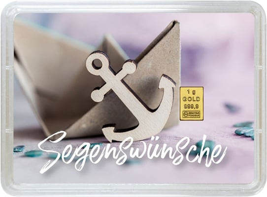 Das Design ist dem Anlass entsprechend sehr festlich gestaltet. Verpackt ist der 1 g Goldbarren „Alles Gute zur Taufe“ in einer praktischen Plastikblister-Geschenkkarte mit zur Taufe passender Beschriftung und Motiven. Neben den Inschriften „zur Taufe“ und „Segenswünsche“ ist ein Anker abgebildet. Zu sehen sind außerdem Fische, die zu den bekanntesten Erkennungssymbolen der Christen zählen. Ein Echtheitszertifikat gibt es in der Motivbox mit dazu. Der kleine Barren ist nur mit den nötigsten Informationen zum Gewicht von 1 g und dem Feinheitsgrad 999,9 versehen. Hinzu kommt noch das Logo von Valcambi. Mit diesem zeitlosen Geschenk treffen Sie für Taufkinder eine gute Wahl. Es gibt diesen 1 g Barren zudem noch passend zu anderen festlichen Anlässen wie etwa als Präsent zu Weihnachten oder zum Geburtstag. Diese besonderen Geschenkbarren sind eine tolle Erinnerung, aber zugleich auch eine kleine, stabile Wertanlage für Krisenzeiten.