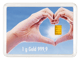 Der Goldbarren besticht mit einem besonderen Kippbild. Je nach Blickwinkel zeigt die Vorderseite zwei unterschiedliche Bilder. Auf der einen Seite ist das Feingewicht von "1 g Gold" und die Feinheit von "999,9" angegeben. Das Motiv zeigt zwei Hände, die ein Herz um den enthaltenen 1 g Goldbarren formen. Der Hintergrund ist ein blauer, wolkenloser Himmel. Auf der anderen Seite ist ein Herz aus Wolken abgebildet, welches vor einem himmelblauen Hintergrund ist. Der Schriftzug "Für eine goldene Zukunft" ist auf dieser Seite ebenfalls zu lesen.