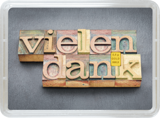 Der 0,5g Goldbarren mit dem Motiv „Vielen Dank“ vom Barrenhersteller Valcambi SA eignet sich hervorragend als Geschenk um einfach mal Danke zu sagen. Der barren wird sogar mit Echtheitszertifikat in der attraktiven Motivbox ausgeliefert.